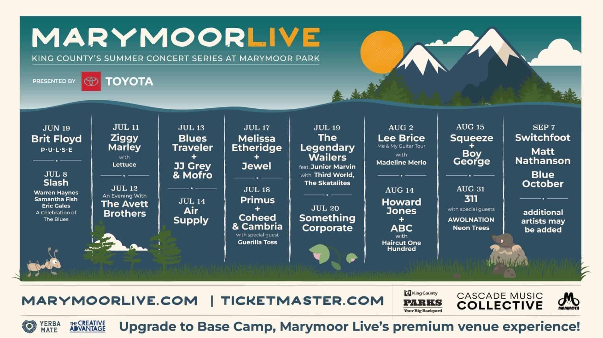 Marymoor Park 6046 W. Lake Sammamish Pkwy. N.E., RedmondShows Aug. 2, 7 p.m. Lee Brice with Madeline Merlo $55 - $60 Aug. 14, 6 p.m. Howard Jones & ABC with Haircut One Hundred $39 - $194 Aug. 15, 5:30 p.m. Squeeze / Boy George $69 - $74 Aug. 31, 6 p.m. 311: Unity Tour with special guests…